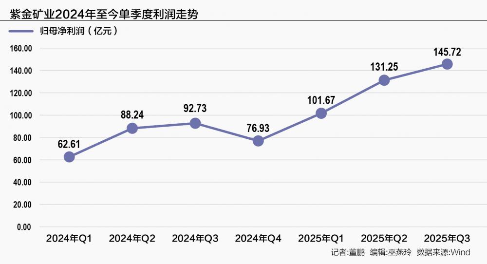 紫金矿业上周末披露的三季报显示,当期归母净利润增长55.5%至378.6亿元,其中第三季度净利润达到145.7亿元,再次刷新历史更好成绩。
