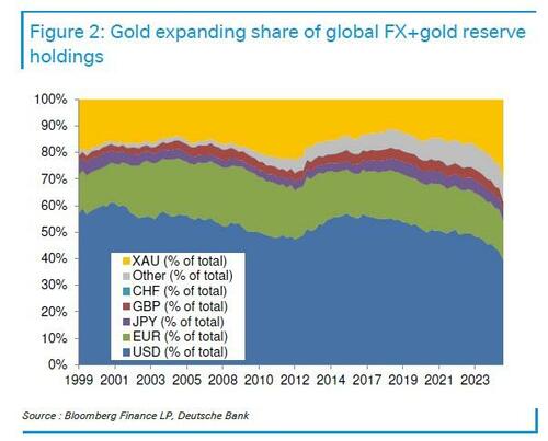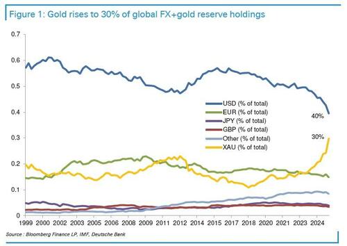 与此同时,美元在同一口径下的占比从43%降至40%。这意味着黄金与美元之间的差距已从19个百分点收窄至10个百分点,缩小了近一半。