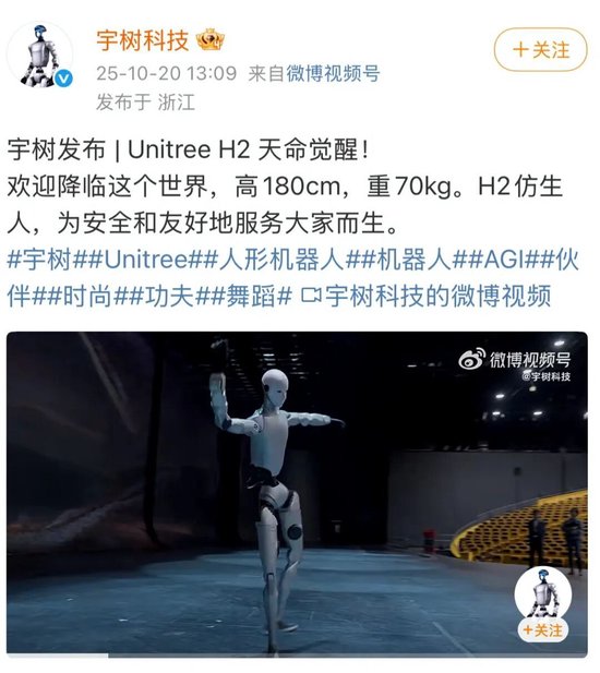 10月20日,宇树科技发布Unitree H2仿生,高180cm,重70kg。