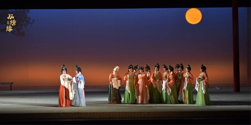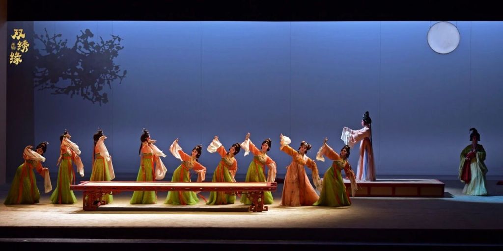 《双绣缘》的舞台成功地将绘画、舞蹈、音乐等艺术语汇熔铸于戏曲舞台之上。导演徐春兰“每一帧都是画”的艺术追求,通过舞美与灯光对唐代名画《捣练图》神韵的汲取,化为流动的、充满呼吸感的盛唐气象。