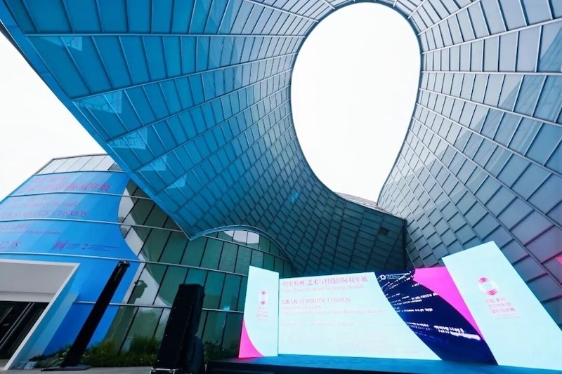 澎湃新闻了解到,此次中国(杭州)艺术与科技国际双年展的举办地为全新启幕的余杭美术馆。该美术馆坐落于杭州良渚新城玉湖综合体南侧水域的小岛上,建筑面积为6160平方米,于2024年竣工。馆身以双环同构的圆璧之形,营造出“悬浮”于天地之间的意象。馆体外立面采用了玉石玻璃和铝板的创新结合,在夜晚时分呈现360°动态投影。