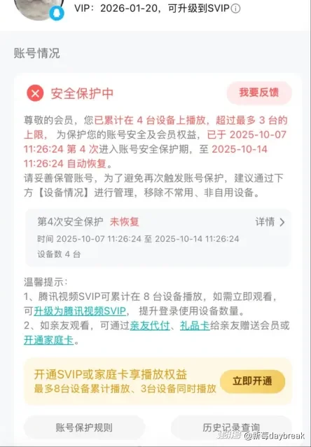一位用户的VIP账号被检测到累计在4台设备上播放,平台称「为保护账号安全及会员权益」,将开启7天的账号保护期,到期将自动恢复。