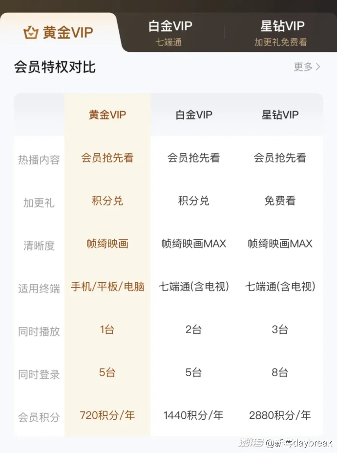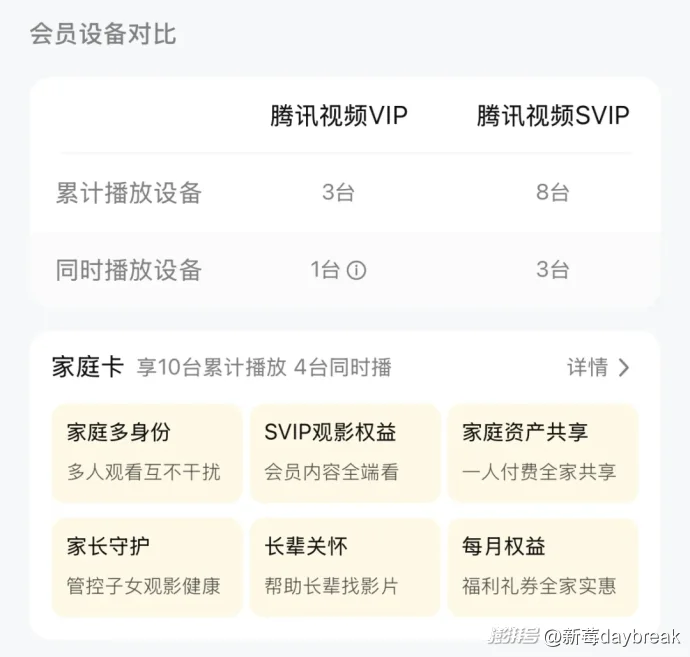 除此之外,跟腾讯视频一样,爱奇艺跟据不同会员级别对应同时播放设备台数、清晰度等权益。背后折射的都是会员含金量在下降的问题。