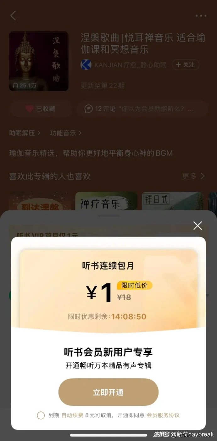 她仔细辨认后发现,要想继续听,必须成为「员中员」,「这已经涉及听书功能,不再属于音乐范畴」。而后不久,腾讯音乐全资收购在线音频平台喜马拉雅。