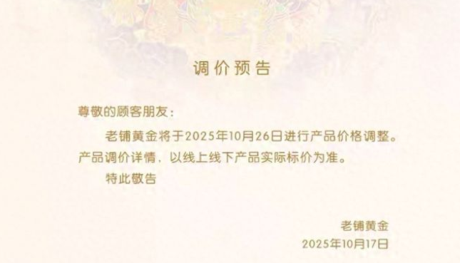10月17日,老铺黄金发布预告,公司将于10月26日进行产品价格调整。具体调整的幅度与范围将以线上线下门店实际标准为准。