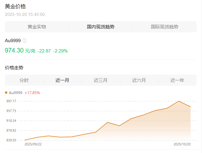 黄金价格还在持续上涨。尽管10月20日金价有所回落,但在过去一个月里,黄金的价格上涨了约17.85个百分点。