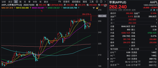10月20日晚间,苹果大涨近4%,盘中股价突破264美元,创历史新高。苹果公司市值逼近3.9万亿美元,再次反超微软成为美国市值第二高的公司。