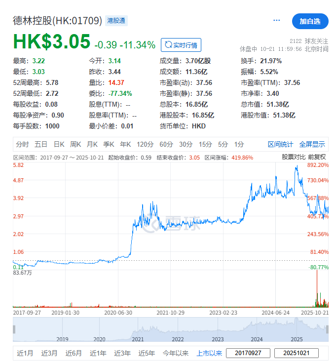 截至发稿时间,德林控股(01709.HK)每股收报3.05港元,总市值约51.38亿港元。