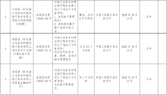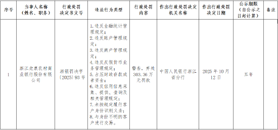 10月21日金融一线消息,中国人民银行浙江省分行行政处罚决定信息公示表显示,浙江龙泉农村商业银行因违反金融统计管理规定;违反账户管理规定;违反商户管理规定;违反反假货币业务管理规定;占压财政存款或者资金;违反信用信息采集、提供、查询及相关管理规定;未按规定履行客户身份识别义务;与身份不明的客户进行交易,被中国人民银行浙江省分行警告,并处303.36万元罚款。