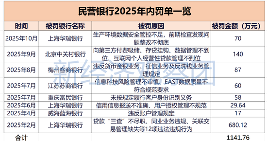 据新经济观察团不完全统计,2025年开年至今,上海华瑞银行、北京银行、梅州客商银行、江苏苏商银行、重庆富民银行、威海蓝海银行等6家民营银行合计被罚1141.76万元。