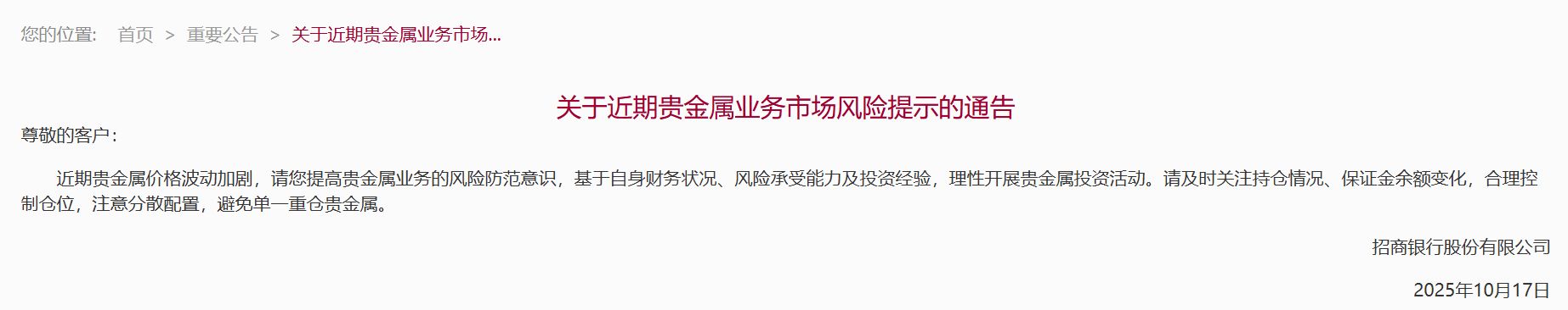 招商银行也表示, 及时关注持仓情况、保证金余额变化,合理控制仓位,注意分散配置,避免单一重仓贵金属。
