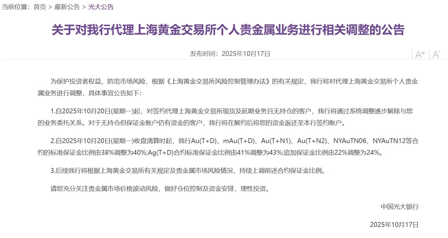 近日,发文称,自10月20日(星期一)起,对签约 *** 上海黄金交易所现货及延期业务且无持仓的客户,该行将通过系统调整逐步解除业务委托关系。同时,光大银行还将调整合约保证金。