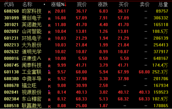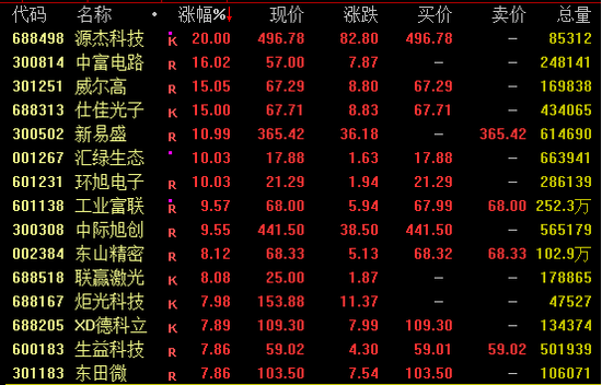 场内超4600股飘红,地产板块走高,、、等涨停。AI产业链股集体走高,(688498)尾盘涨停逼近500元大关,续创历史新高;涨超10%,涨超9%;、双双大涨。海洋经济概念崛起,、等涨停。消费电子概念活跃,、、等均涨停。值得注意的是,今日再度涨停,近8日斩获7板,累计涨幅已翻倍;3连板的跳水跌停。