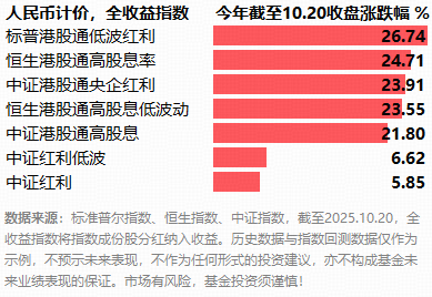 今年至今,港股通红利ETF(159220)的标的指数标普港股通低波红利指数走势表现突出,与各常见港股、A股红利主题指数的对比中,拔得头筹。截至10.20,今年以来指数上涨26.74%(人民币计价,全收益指数),优于恒生港股通高股息、中证港股通高股息等指数的走势。