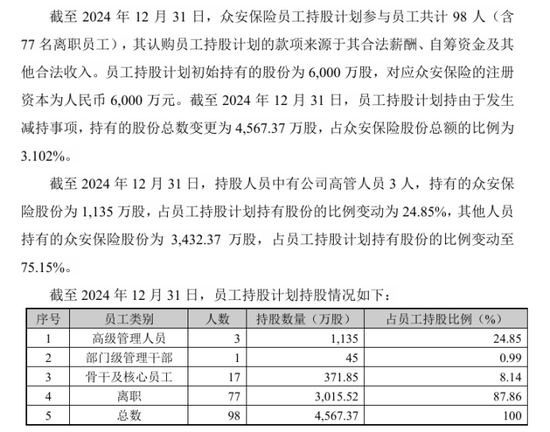 据众安保险2024年年报数据显示,截至2024年12月31日,该公司员工持股计划持由于发生减持事项,持有的股份总数变更为4567.37万股,占众安保险股份总额的比例为3.102%。持股人员中还在职的公司高管人员有3人,部门及管理干部1人、骨干及核心员工17人。