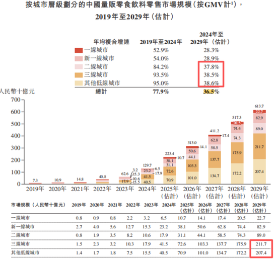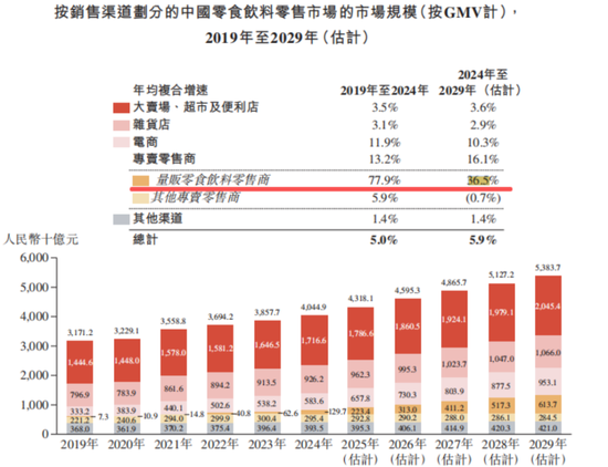 据灼识咨询,量贩零食赛道将继续高速增长,到2029年,量贩零食饮料零售市场规模将达人民币6137亿元,2024-2029年的预期年均复合增速为36.5%。