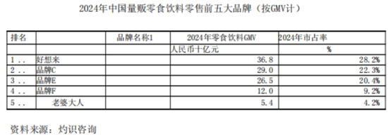 在中国量贩零食饮料零售市场的竞争格局中,按2024年零食饮料GMV计算,“好想来”市占率高达28.2%,“老婆大人”以4.2%的市占率位列第五。