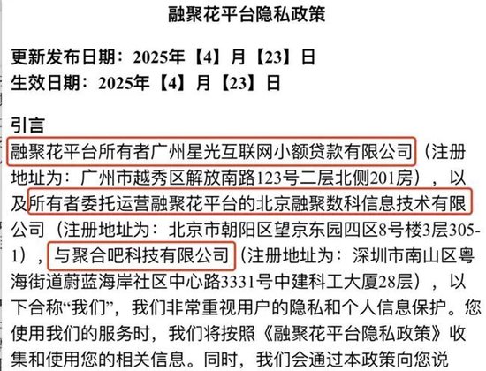 应用商城信息显示:“融聚花”App的开发者为星光小贷。隐私政策信息披露,融聚花平台所有者为广州星光互联网小额货款有限公司以及所有者委托运营融聚花平台的北京融聚数科信息技术有限公司,与聚合吧科技有限公司。北京融聚数科信息技术有限公司成立于2021年8月,大股东为聚合吧科技有限公司,持股60%。
