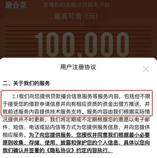值得一提的是,“聚合花”的《注册协议》中,“关于我们的服务”显示,“我们向您提供贷款撮合信息服务等服务内容,包括但不限于接受您的借款申请信息并向有相应资质的资金出借方推送,并就前述服务内容提供技术服务支持。”