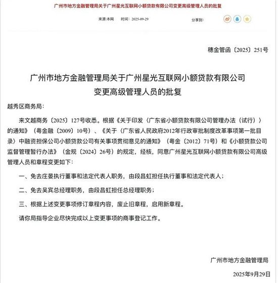 近日,广州市地方金融管理局关于广州星光互联网 *** 有限公司变更高级管理人员的批复显示,庄晏被免去星光小贷执行董事和法定代表人职务,吴宾被免去星光小贷总经理职务,三个职务均转由段昌虹担任。