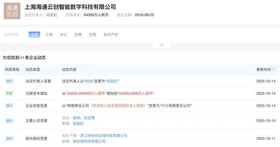 此外,今年10月,段昌虹成为上海海通云创智能数字科技有限公司(简称“海通云创”)的法定代表人及公司董事。海通云创的股东里同样出现了聚合吧科技有限公司的身影,持股比例为46.875%。