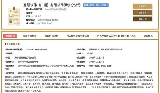 国家企业信用信息公示系统显示,段昌虹2025年2月起担任亚联软件(广州)有限公司(简称“亚联软件”)深圳分公司的负责人。亚联软件有两家股东,其中聚合吧科技有限公司持有70%股份,为控股股东。