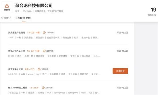 记者注意到,作为一家支付科技公司,近期聚合吧在前程无忧、猎聘网等 *** 平台上发布了大量和贷款业务相关的岗位 *** 信息,包括信贷产品经理、信贷数据分析师、消费金融产品经理、信贷APP产品经理等,工作地点均显示在深圳。这被外界解读为聚合吧正在为接盘星光小贷、布局网贷业务做准备。