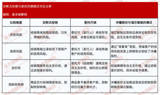 为了清晰地辨析这两种模式的差异,基本面解码对买断式经销和委托代销的核心特征进行了对比,并列出了沐曦股份与瑞芯智能交易模式的具体情况。