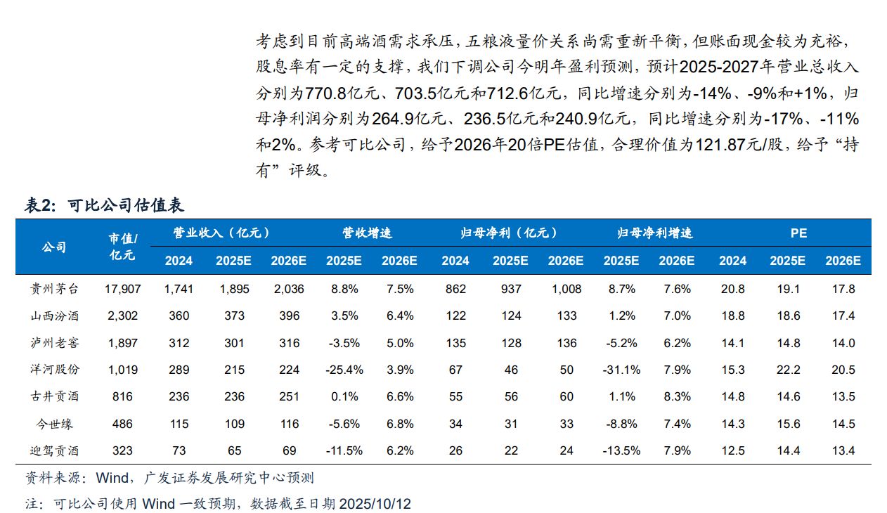 与此同时,广发证券还发布了题为《五粮液(000858.SZ)量价需再平衡,下调今明年盈利预测》的研报。在这份研报中,广发证券更是抛出了“五粮液、泸州老窖‘易位’”的观点。