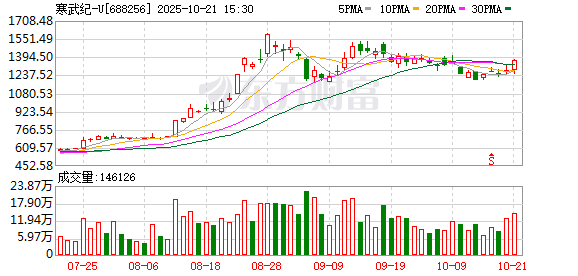 证券时报·数据宝统计显示,寒武纪-U今日收盘价为1368.96元,上涨6.86%,日换手率为3.49%,成交额为192.41亿元,全天主力资金净流入1.63亿元,近5日该股累计上涨14.46%,近5日资金合计净流入6.20亿元。