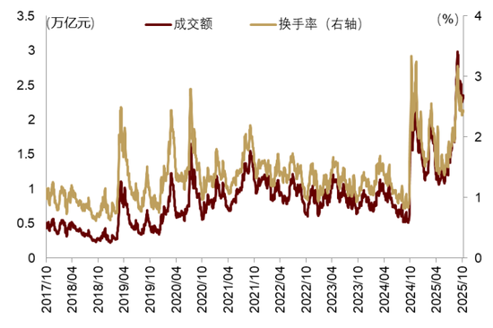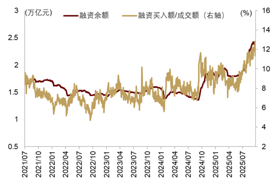美联储重启降息,全球流动性和风险偏好回暖,中国股市场情绪保持高位,风险资产共振上行。产业层面,OpenAI、甲骨文、英伟达达成“投资-算力采购-硬件供应”的闭环合作,进一步推升全球风险偏好,A股与全球主要股指共振向上(详见《渐入财政主导,布局全球水牛》)。9月沪深300和标普500分别上涨3.2%和3.5%,为4月关税扰动以来连续第5个月收涨。其中,恒生科技和和创业板指数9月单月分别上涨14%和12%,年内涨幅领跑全球主要市场。10月以来市场有所回调,但A股市场情绪保持高位。9月日均成交额2.42万亿元,较8月的2.31万亿元进一步上升(图表12);融资余额从8月的2.08万亿元上升至9月的2.35万亿元,9月融资买入额占全部成交额的比例约为11.5%,为近10年以来新高(图表13)。特别的,10月9日A股融资净买入额达到508亿元,仅次于2024年10月8日的1074亿元。