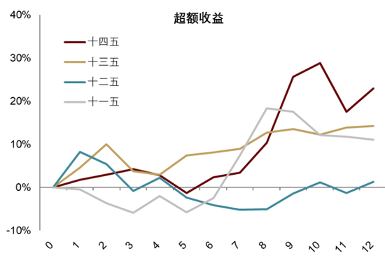 注:五年规划相关行业指数来自图表23所示行业,0时刻为规划建议公布时期,一般为规划正式通过前一年的10月