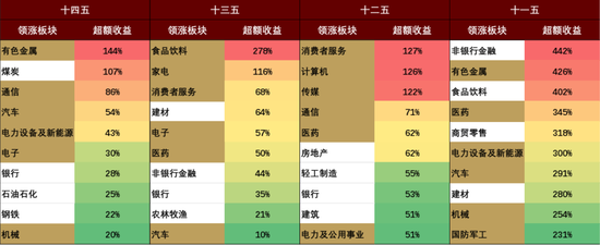注:行业表现为规划建议公布(一般为规划正式通过前一年的10月)之后的五年累计相对万得全A指数的超额收益(下同),黄色背景为规划重点支持相关行业