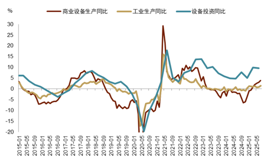 设备投资热潮持续,工业生产复苏。7月工业生产同比升至1.5%,其中商业设备生产同比升至3.8%,为2023年以来更高。对应的,设备投资同比在一、二季度分别达到9.9%和9.6%(图表3)。在经历了22年以来的厂房建设潮后,设备投资和工业生产上行周期已经开启(参见《布局美国设备投资重启:总量篇》),且可能受大而美法案加速折旧政策的 *** 。在这种情况下,I *** 和Markit制造业PMI均走出上行趋势。