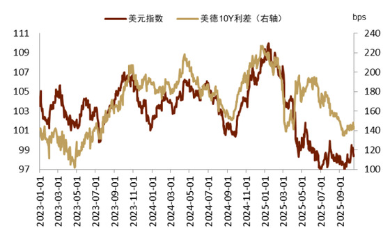 伴随 *** 停摆关键经济数据不公布后,市场进入流动性主导,叠加当前估值偏高,市场波动加剧。从5月起,依靠TACO交易和降息交易全球风险资产普涨,美股再次站上历史高位(图表7),市场开始担忧回调风险,9月底官方流动性(美联储准备金)收紧、地缘风险等因素均造成了市场回调。特别是10月10日,特朗普宣布于11月1日起加征中国100%新关税[4],全球风险资产大跌、黄金大涨。债市方面,由于缺乏基本面数据,美债利率曲线基本没有发生变化,暂时缺乏方向,而欧债利率走低,美德利差走阔,支撑美元指数上行。
