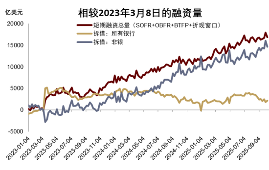 往前看,鉴于两党在财政方面分歧较大,我们预计美国 *** 仍有继续停摆的可能,关键经济数据缺失、流动性主导的局面仍将持续。当前市场通过回购市场进行的融资规模较大,特别是非银体系大量借款(图表11),且从SOFR与ON RRP利差持续偏高的情况来看,私人部门融资需求持续旺盛。这部分杠杆或受市场情绪的影响较大,加剧跨市场的价格波动。当前官方流动性(联储准备金)规模偏低,10月15日和16日透过美联储SRF(常设回购机制)获得的借款量分别达到67.5亿和83.5亿美元的高位[5],或与近期地区银行的坏账问题有关[6]。若流动性波动造成市场风险,美联储有可能停止缩表甚至重启扩表。整体来看,我们认为,虽然中长期美股仍有基本面支撑,且流动性周期重启宽松,但短期内,中美贸易摩擦升级、金融风险等事件可能触发市场阶段性回调。