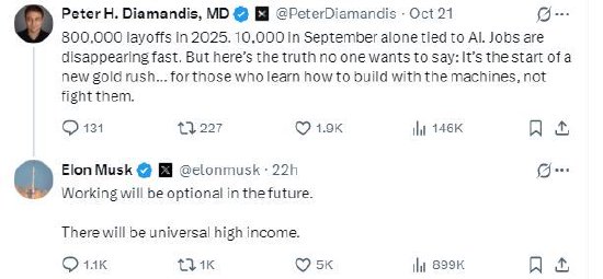 此前一天,马斯克回应了另一位网友的帖子,该帖子称:“美国2025年已裁员80万人。仅9月份就有1万人的裁员与AI有关。工作岗位正在迅速消失。但有一个没人愿意说的事实:这是新一轮淘金热的开始……对于那些学会如何与机器一起建造,而不是和它们战斗的人来说。”