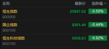 今日港股三大指数集体低开,恒生指数跌0.50%,报25897.62点,恒生科指跌0.82%,国企指数跌0.44%。盘面上,科网股普跌,百度、网易、阿里巴巴、快手跌超1%;创新药概念多数高开,信达生物涨超9%;中资券商股活跃,中信证券涨超1%;黄金股普跌,紫金黄金国际跌超6%。