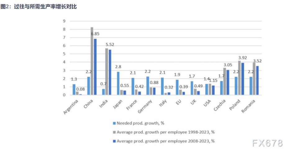 要判断各经济体是否有能力应对这一挑战,或许考察更长期的历史劳动生产率增长情况更具启发意义。图2将所需生产率增速(1.5%加上2050年前经济活动人口的平均预期降幅)与所述经济体1998-2023年间人均劳动生产率的历史增速进行了对比。