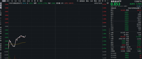 或由于国际金价跳水,黄金龙头领跌,今日(10月22日)揽尽有色金属行业龙头的有色龙头ETF(159876)深陷水面以下,场内价格现跌1.73%,实时成交额近3000万元,交投较为活跃。