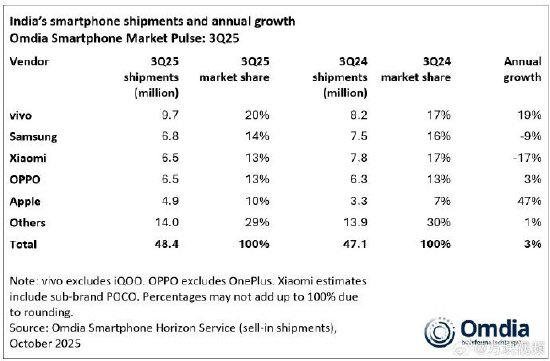 10月22日,据Omdia最新报告显示,2025年第三季度,印度智能手机出货量达到4840万台,同比增长3%。。