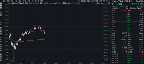 盘面上,今日(10月22日)重点布局国产AI产业链的科创人工智能ETF(589520)随市盘整回调,场内价格现跌0.50%。