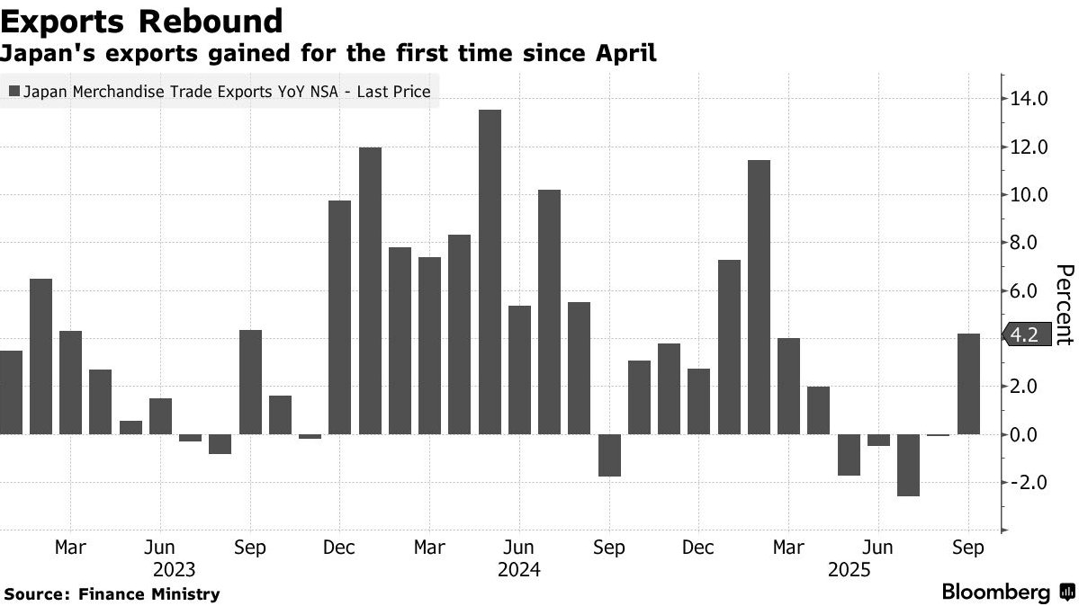 日本财务省周三公布,9 月出口同比增长 4.2%,为五个月来首次扩张,芯片与电子零部件出货增加,加上矿物燃料出口回升,共同拉动整体表现。不过这一增幅略低于经济学家预测的4.4%。其中,对美国出口同比下降13.3%,已连续第六个月萎缩;对欧盟出口增长5%,对中国出口增长5.8%。