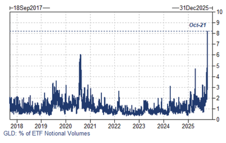 据高盛的数据,黄金ETF GLD的成交额一度占到美国所有上市ETF名义总成交额的8%,这是其数据库中有记录以来的更高份额。