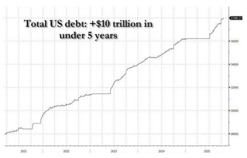 尽管市场遭遇重挫,但高盛认为,驱动金价上涨的长期宏观背景并未改变。例如,美国国债总额刚刚触及37.98万亿美元的历史新高。
