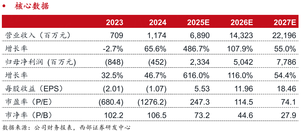 考虑到国内AI算力需求的高速增长以及公司在AI计算领域的长期积累,我们预计公司2025年-2027年营业收入为68.90亿元、143.23亿元、221.96亿元,同比增长486.7%、107.9%、55.0%,维持“买入”评级。