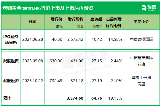 这是老铺黄金上市后的第二次配股融资,今年5月份,老铺黄金配股融资27.15亿港元。