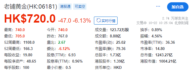 老铺黄金(06181.HK)于2024年6月28日在香港挂牌上市,当时以每股40.50港元的IPO发行价募资10.42亿港元。截至发稿时间,其每股收报720港元,较IPO发行价大涨16.78倍,目前市值约1,243.27亿港元。
