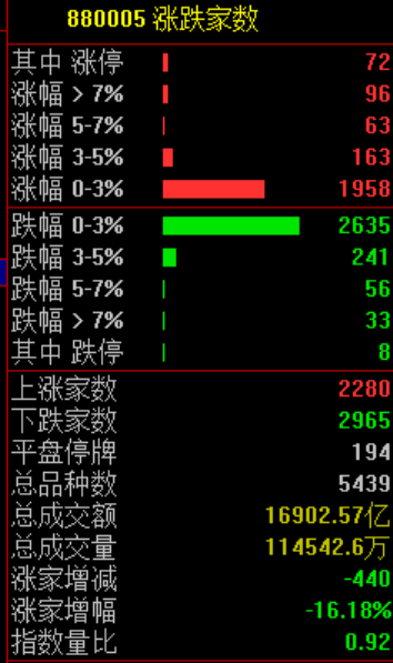 市场共2280只个股上涨,72只个股涨停,2965只个股下跌。