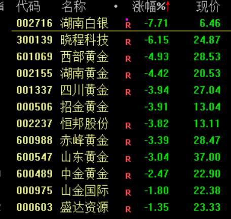 下跌方面,黄金概念股下挫,跌超7%。消息面上,此前现货黄金一度下跌6.3%,创下自2013年4月以来的更大单日跌幅。现货白银日内一度跌幅达8.7%,创下自2021年以来的更大跌幅。